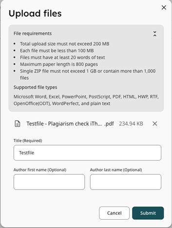 You will be asked to fill in your first name, last name and the title of the document. Next, you can submit the document that you want to be scanned by browsing via the ‘Choose File’ button. The requirements of the file can be found on the right side of the screen – the file should not be larger than 100 MB or 800 pages, and can be a variety of document types, such as Word, PostScript, PDF, HTML, Excel, PowerPoint, Word Perfect WPD, OpenOffice ODT, RTF and Hangul HWP.