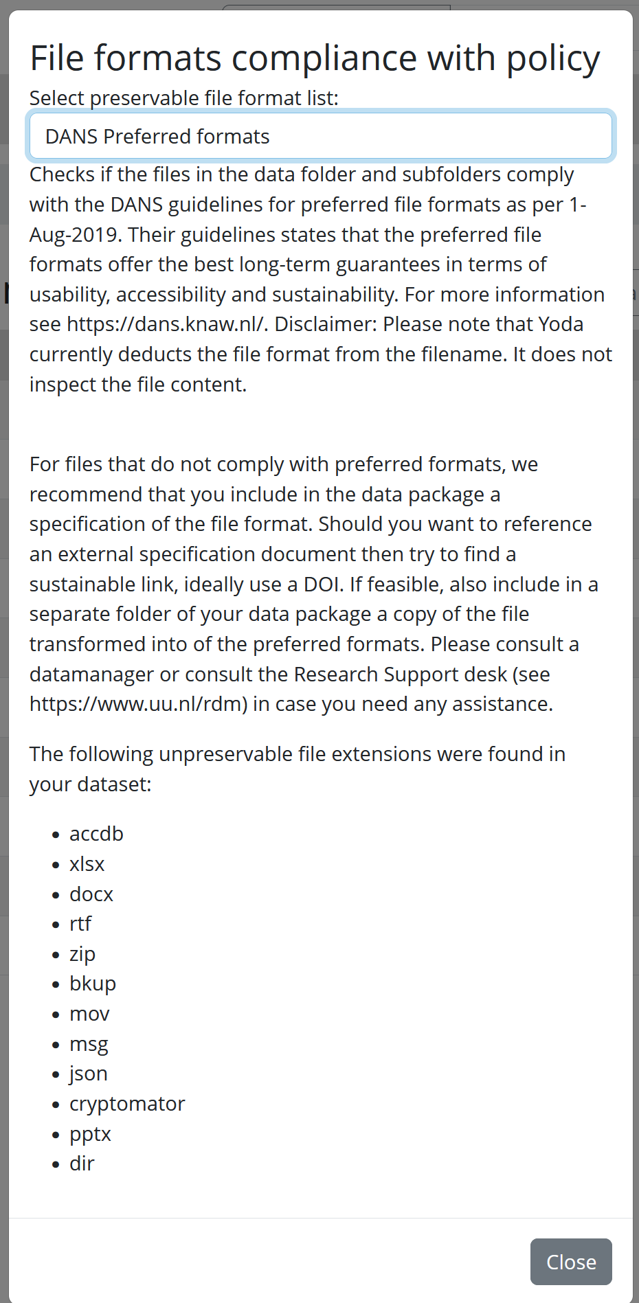 You can check in Yoda if you are in compliance with either the DANS Preferred formats or the 4TU Preferred formats by pressing the “Actions (Check for compliance with policy)” button.