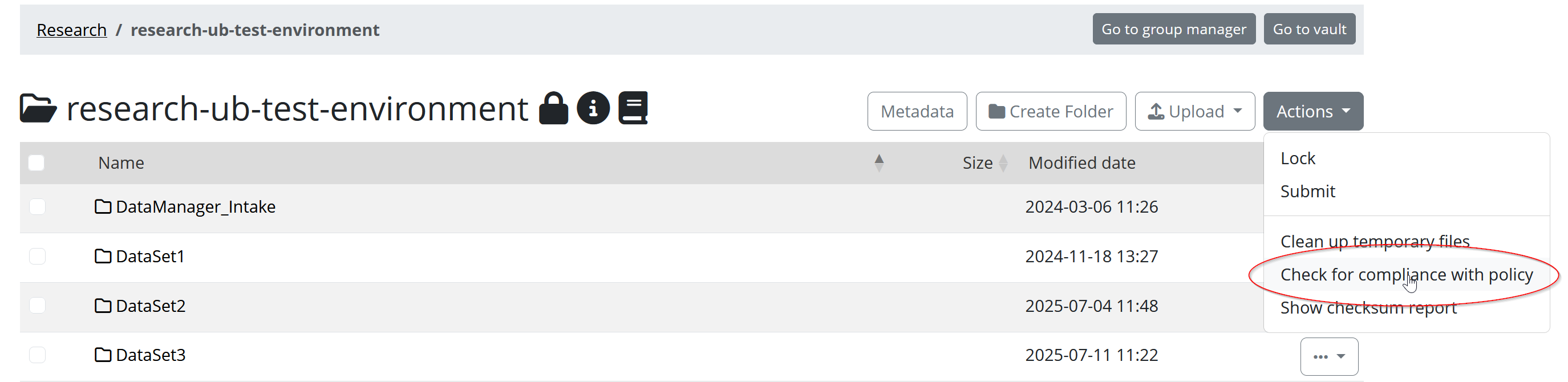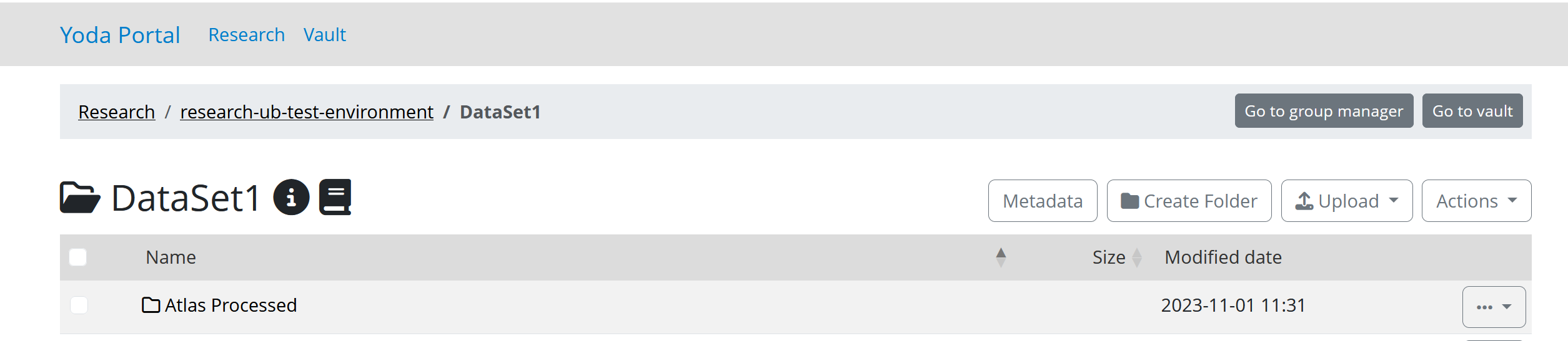 The vault of your group becomes visible in the Yoda portal once it contains at least one data package. It has the same name as the research folder, except it starts with vault- (e.g. research-ub-test-project will have a Vault folder called vault-ub-test-project) . Everyone with access to your group research folder also has read-only access to the vault of your group.