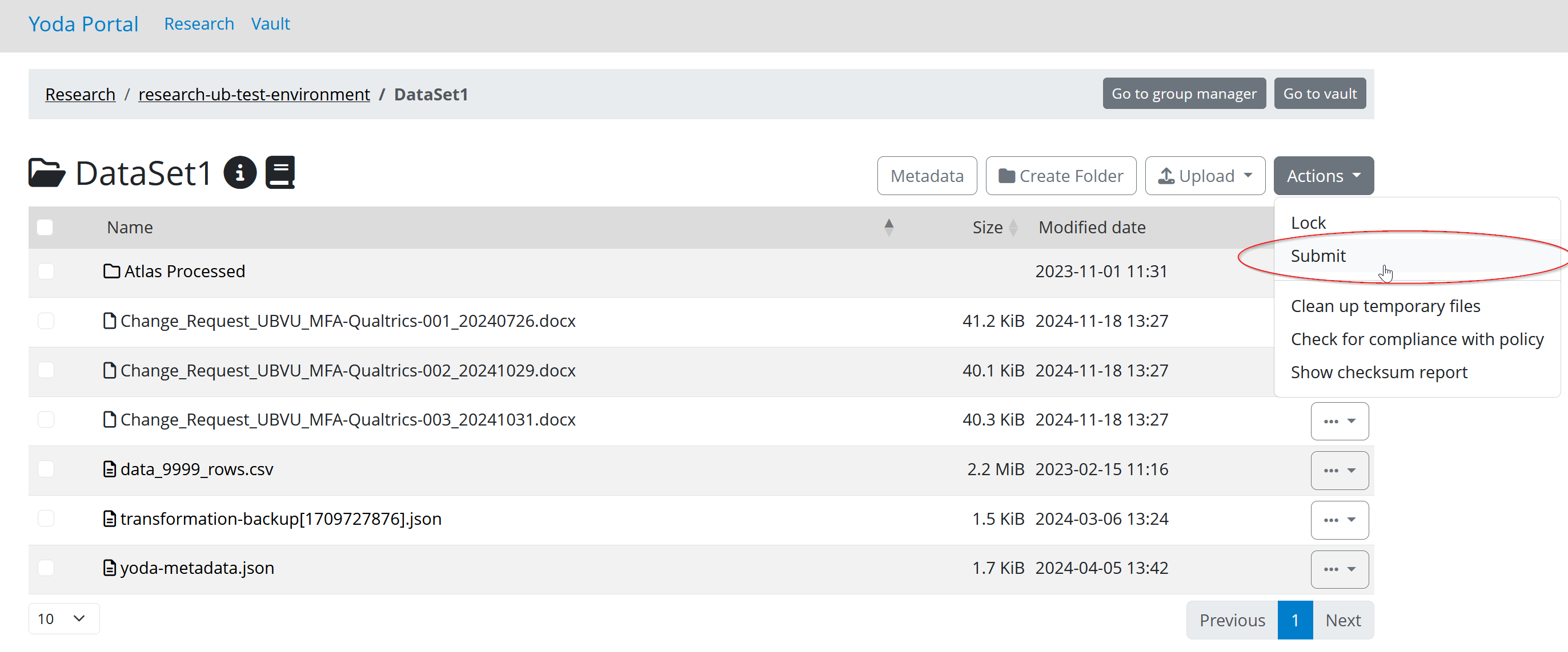 1. First, navigate to the folder you want to archive in the Yoda portal. Ensure that you are in the folder which you want to submit to the vault. Check that all mandatory metadata has been entered in the metadata form of the folder.