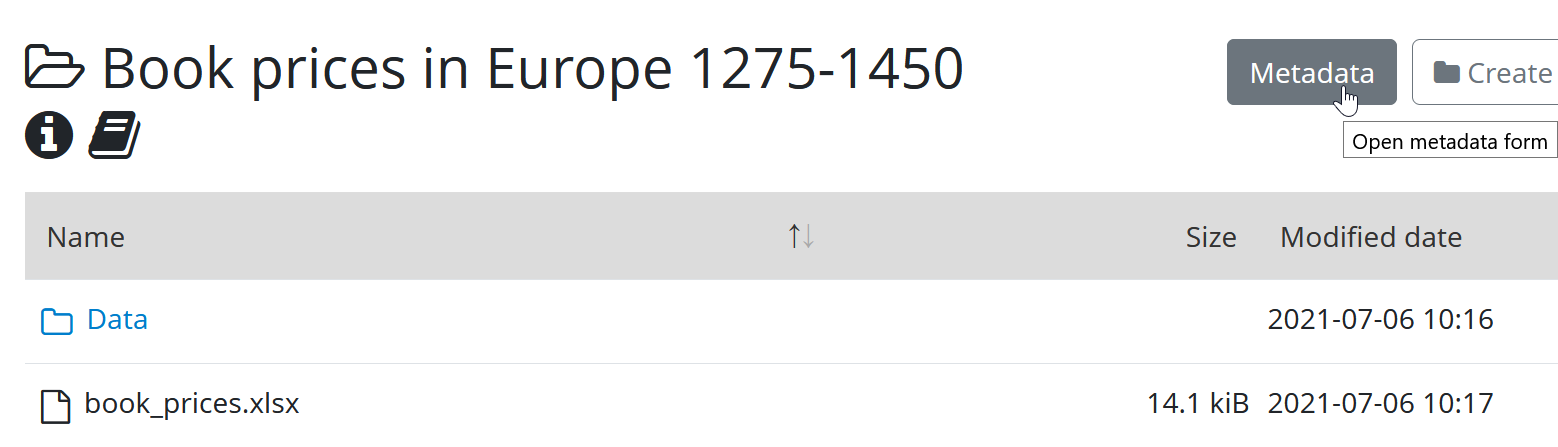 - navigate to the folder in the Yoda portal and press the “Metadata” button.